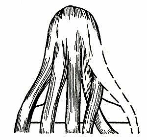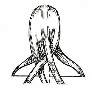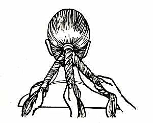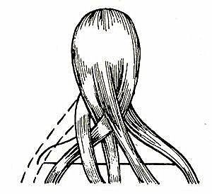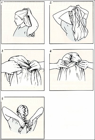 (а) Правой рукой взяться за середину косы. Перекрутить ее вправо на пол-оборота, при этом вы почувствуете, что верхняя часть косы начинает "скручиваться", Левой рукой подтянуть верхнюю часть косы вверх и влево; скручивание еще более усилится. Расположить образовавшуюся петлю на голове так, чтобы ее середина находилась рядом с верхней резинкой. У вас получилась левая петля "восьмерки", для которой вы использовали половину длины косы. Теперь нужно закрепить петлю шпильками.